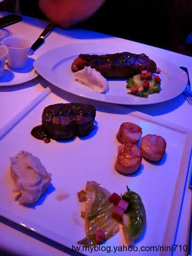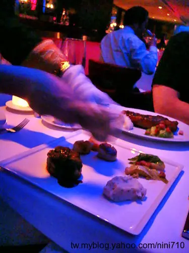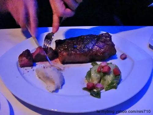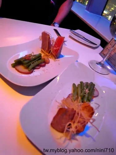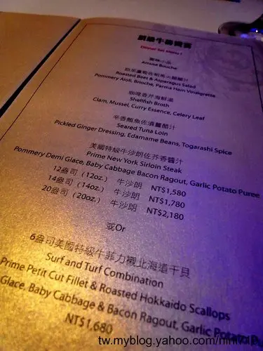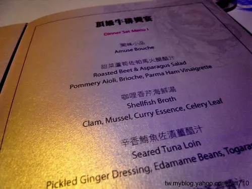 頂級牛排饗宴的菜單,給有興趣的朋友參考一下,價位好像比茹絲葵和金磚便宜耶!46樓最一開始是法國料理,後來變成半法半東方料理,現在變成牛排館,但是好像感覺也有一點法國料理的FU存在,不知為什麼他們要改來改去的呢?這裡的服務真的很好,但是有點小小不微詞的是,前菜辛香鲔魚是生的,我對生的或魚不大愛,所以跟服務生表示可以換個菜色嗎?我不喜歡吃魚,服務生詢問完主廚後說只能幫我把鮪魚弄熟,沒辦法換菜色,有點太強硬了些,別家餐廳幾乎都會很樂意幫客人換呢!好可惜,把這種適合生吃的魚弄熟,會不會太可惜了些?