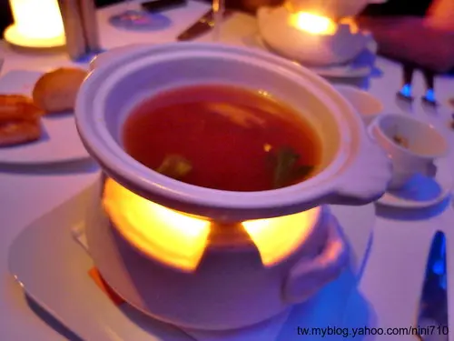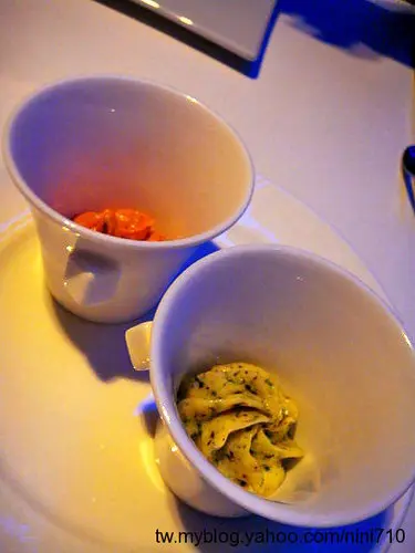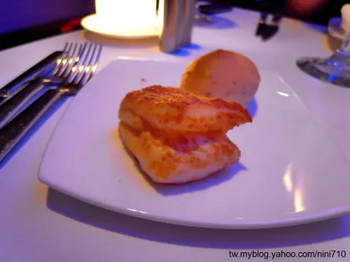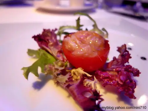 開胃小前菜,小蕃茄裡加了有點像油漬的蟹肉絲,清爽的感覺,一口吃下去後真的讓人胃口全開了,這張也是整個晃啊!