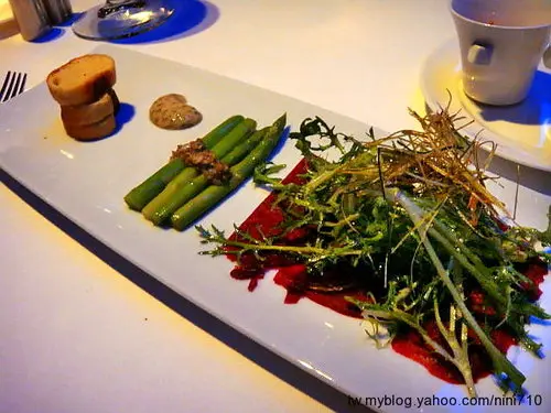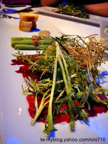 甜菜蘆筍佐帕馬火腿醬汁的沙拉,這道我喜歡,好大一盤啊!而且不太像一般的沙拉,一次可以吃到三種沙拉,最左邊是奶油味很重的小餅乾,乾乾脆脆的味道好香啊!中間的是清爽的燙蘆筍搭上帕瑪火腿弄碎後的醬汁,蘆筍清甜,醬汁濃鬱夠味,煙燻的很美妙