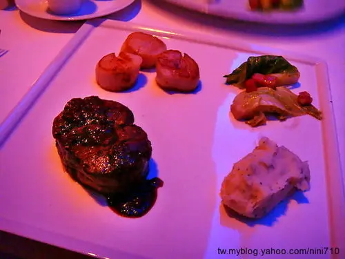 我的主餐6盎司美國特級牛菲力襯北海道干貝,對不起,真的越來越暗,不然真的看起來就很可口呢!我的牛菲力超超超超級軟的軟,太適合老年人了,三顆大大的干貝也煎烤的很適宜,非常多汁與香甜啊!
