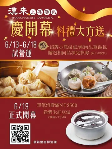 南紡購物中心又有新店進駐囉!這次是漢來系列集團旗下的漢來上海湯包,開設的地點就在南紡的B1,目前到6/18都是試營運階段,6/19正式開幕,不過雖然說是試營運,但其實已經有不少人都聞香而來,第一天的中午就已經整間店坐滿了,想必大家應該是期待很久了才是。 試營運期間漢來上海湯包就搶先推出一系列的優惠活動,要來用餐的朋友可以先參考看看喔~ 店內環境相當寬敞,並沒有太多的佈置,整體就是簡單舒適,今天是試營運首日前來,人潮已爆滿啊~~相信大家對於漢來一定不陌生,光是在南紡購物中心就有漢來蔬食料理和漢來海港吃到飽系列,這上海湯包的進駐已經是第三間了,有種被漢來包場的感覺耶,不過也不得不說漢來是許多人都很喜愛的店,幾乎開在哪裡,哪裡就會有人潮。開吃前,先來壺熱茶漱漱口XD泡椒菇絲 香醋木耳 冰鎮醉雞 這個外觀真的很討喜很可愛,還沒吃就已經先引起我們的注意,打開後的酒香更是讓人驚艷,吃起來清爽軟嫩,而且酒香真的超重!一定會有不少老饕喜愛這一道。川湘口水雞 這道料理也不賴,是四川人的最愛,但其辣度算是小辣,嫩嫩的也還算不錯吃~招牌小籠包/黑松露雞肉湯包 漢來的湯包果然名不虛傳,一口咬下滿滿的湯汁在裡頭,之前吃過鼎泰X的,老實說漢來的完全不輸給他們耶,皮薄肉多又JUICY,真的很好吃!蝦肉生煎湯包 這個也好好吃,外皮很有彈性,裡頭的蝦肉有相當新鮮有彈性,搭配再一起更是相得益彰的美味。芋泥小籠包 芋頭空不能錯過,芋泥完整的被包覆在裡頭,一口咬下有著滿滿的幸福感。蝦肉紅油炒手 擔擔麵 飄香排骨 這排骨有讓我嚇到,很好吃!有種古早味的FU~皮薄肉嫩搭配上一旁的泡菜很對味。清炒高麗菜 原盅燉雞湯 口感濃郁的雞高湯,料多味美很值得點上一嚐。原盅燉牛湯 喝起來清爽甘甜,牛肉嫩口美味~掛霜紅豆糖糕 這道甜點超好吃!第一口吃下我便露出滿滿的笑容,用這個當一餐的結尾再適合不過了。分享到這,你還不拿起電話訂位嗎?那別怪我沒提前跟你說囉XD 店家名稱:台南漢來上海湯包地址:台南市東區中華東路一段366號B1(南紡購物中心)電話:06-2352032營業時間:中午11:30 ~下午 16:00 、下午 17:00~晚上 21:00…Read More