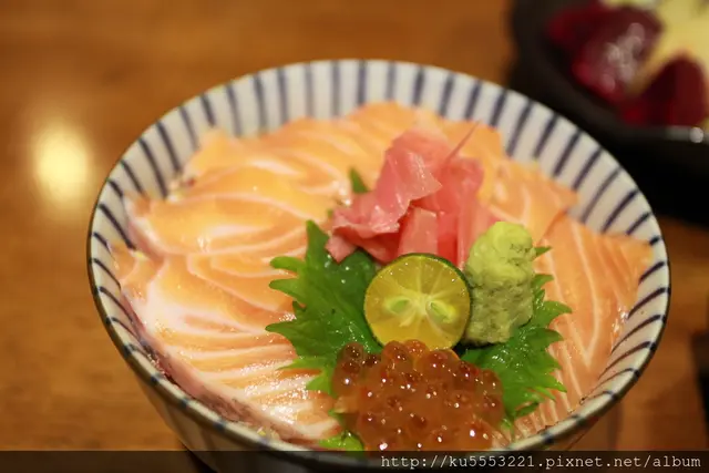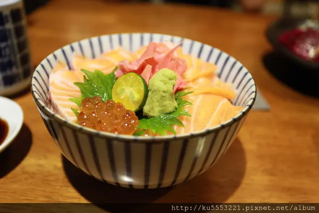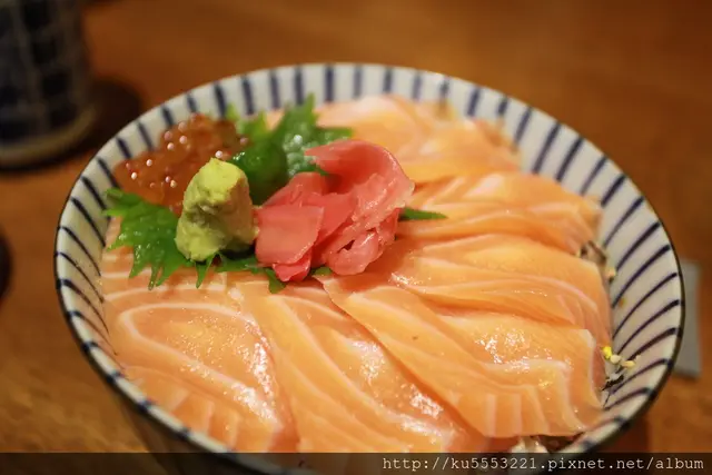 應該有七片鮭魚吧,表面擺上鮭魚卵與現磨山葵,整碗看起來相當美味。