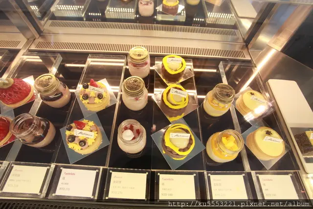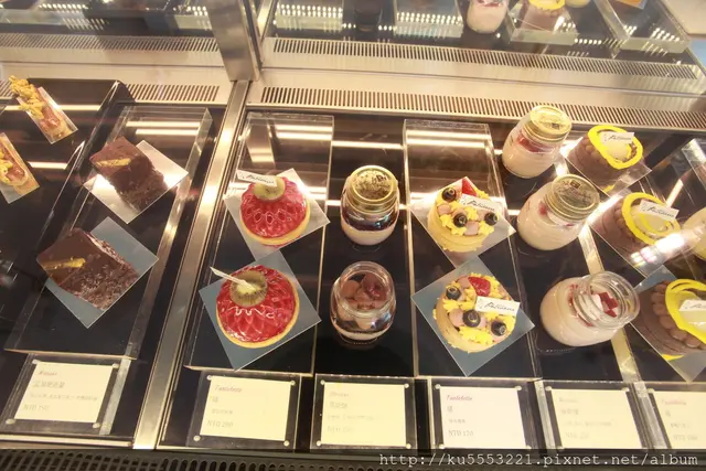 櫃台的冷藏櫃各式甜點,品項相當多且視覺相當精緻,但甜點尺寸看照片不準喔。