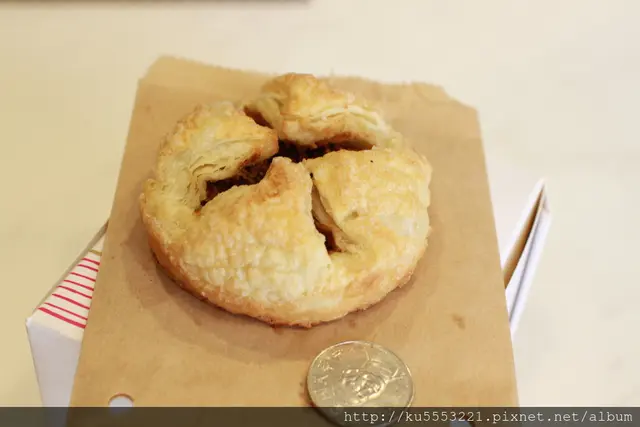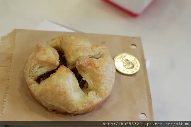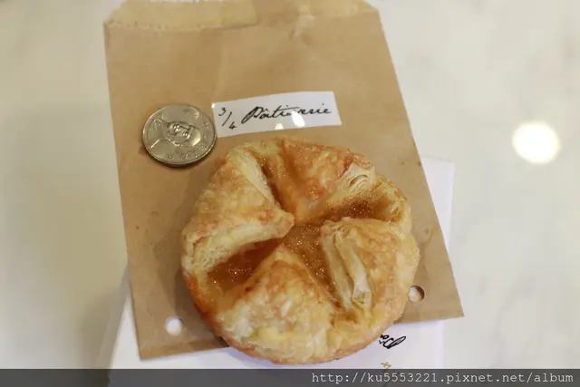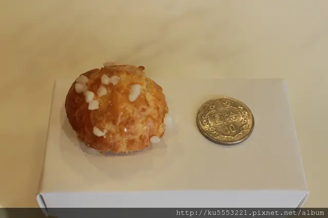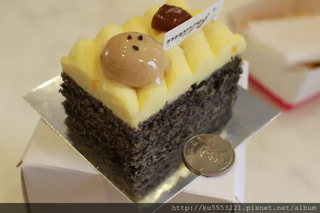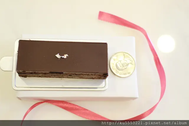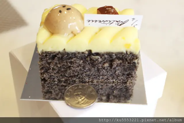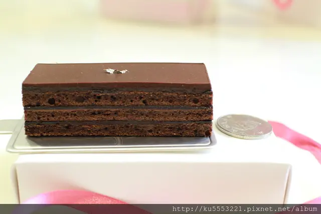 九個層次是店裡的LOGO的發想創意,小高旁邊放著10塊硬幣對照蛋糕尺寸(很小),可能我冷藏隔夜再品嚐口感個人覺得普通。