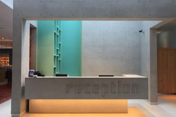 櫃台是目前流行清水模施作,搭配後面水藍色的木板櫃子,一點也沒有清水模讓人感到冷的感覺。