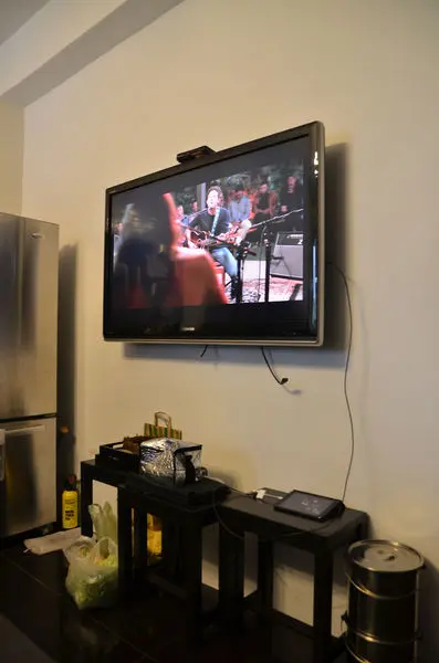 廚房牆面上掛著大大的電視,播放著悅耳舒適的音樂,