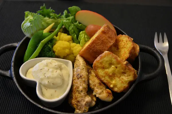 蔬菜、水果、法式麵包、香煎香料雞肉、馬鈴薯泥~每一道都有其特色!