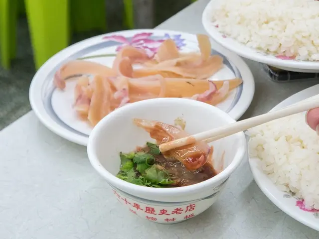 尤魚本身沒有味道,就脆脆的口感,搭配著店家提供的獨家薑泥、加上數種醬料所混成的獨家沾醬來享用,酸甜酸甜的還不錯