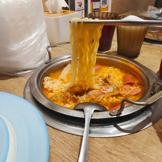 ▼一下子吃太多肉要吃點其他的換換口味,這是韓式部隊鍋附的不倒翁拉麵~吸滿了酸酸辣辣的泡菜湯汁,非常好吃!