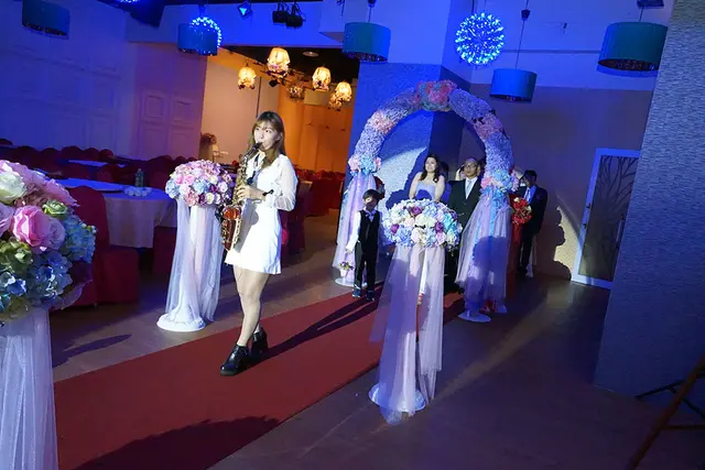 ▽這裡的舞台也好美,不是陽春型的,之前吃喜宴看過太多很陽春的舞台,覺得喜粵樓的好很多~現場還有請婚禮樂團炒熱氣氛~