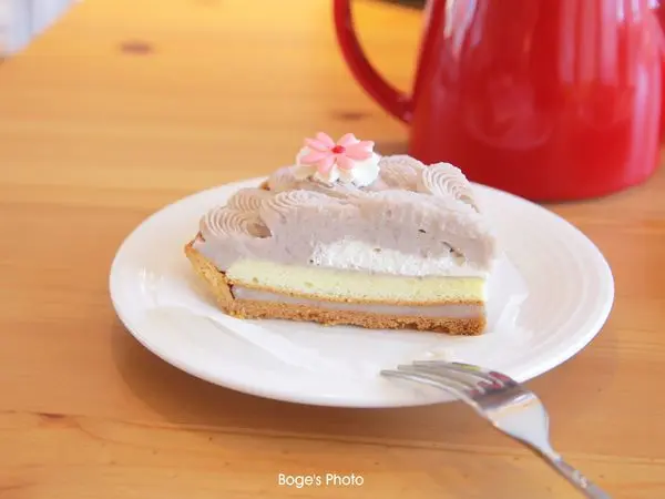最底層的塔皮香而酥,表層的淡紫色芋泥花瓣是使用純芋泥加入北海道奶霜製成的,