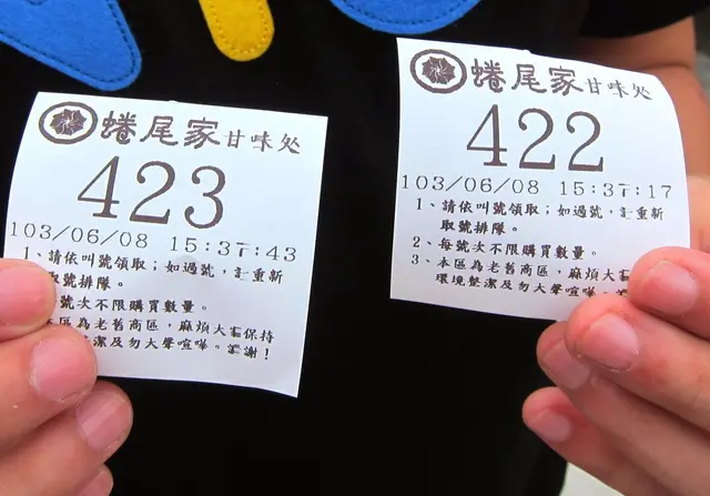 抽了2張號碼牌,才發現一張號碼牌不限購買數量,不過第2張號碼牌也因此救了我們,因為我們到的時候號碼才叫到400號,想說還有一段距離,我們就很放鬆地去逛旁邊的拾參&買布萊恩紅茶,正當我們從悠閒漫步中驚醒,飛奔回到蜷尾家,已經過了422號,剛好叫到423號!嚇死人了~~~
