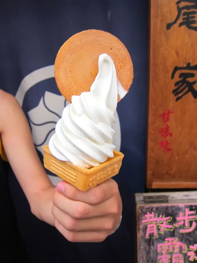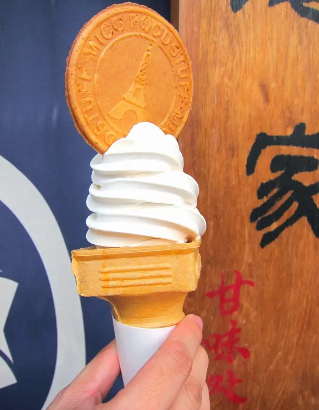 客人點餐後,店員就拿起左邊的甜筒,擠入冰淇淋,最後放上一片法蘭酥,完成!