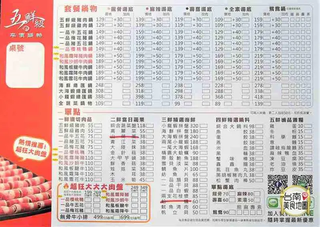 現在來五鮮級平價鍋物-台南國平店享『單點鮮肉品 買一送一』『超狂大肉盤免費增量五盎司』的超值優惠唷꒰ૢ✪ꇵ✪ૢ꒱還有還有『當日壽星送海鮮拼盤一份』『當月壽星送花枝漿一份』啦!家尼丫賀康的優惠,還不趕緊揪揪親好友來開吃啦😄