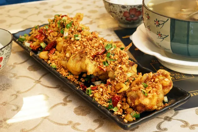 避風塘軟殼蟹 避風塘是粵菜的經典菜式,是指漁民出海遇到颱風時利用船上有限資源做出的菜色,大多以海鮮為主,而且船上很難保存蔬菜,調料以蔥姜蒜為多,所以避風塘的精髓就在於蒜頭酥的獨特風味。當老闆一上菜就能聞到蒜頭酥的香味撲鼻而來,而且我還戴著口罩呢