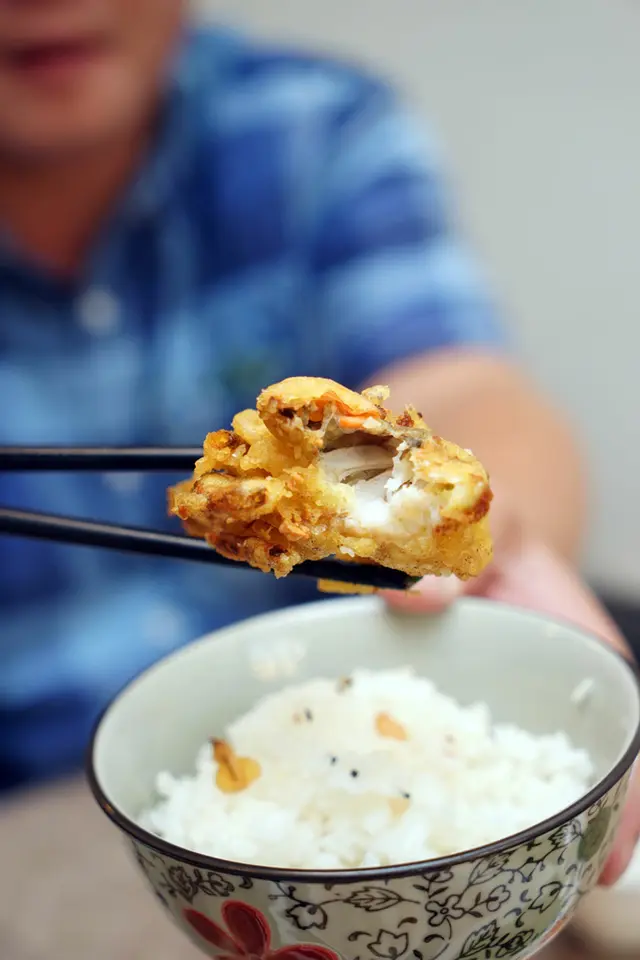當天拍照花了一點時間,軟殼蟹的麵衣有點冷了,但是吃起來還是很酥脆,而且一點都不油膩,麵衣有經過調味,所以不用沾任何東西都很夠味。一口咬下去,軟殼蟹會噴汁!裡面還保有熱度,搭配稍冷的麵衣反而剛剛好