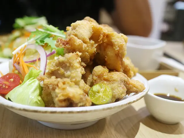 炸雞份量不少,肉質軟嫩彈牙很好吃,附的沾醬是三杯醋,比例與三杯雞類似,再擠上一點金桔更是清爽解膩