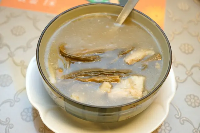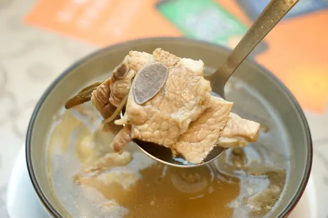 就讓我來一一介紹這次印象深刻的菜色吧!這道排骨湯是在客家莊經常看到的湯品,使用醃製過的乾四季豆,加入菜哺,整體的口感很香,加上軟嫩的排骨,每口都香氣十足。
