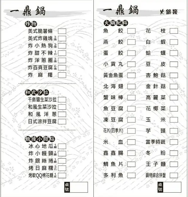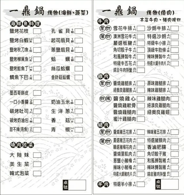 MENU,一鼎鍋採一人499吃到飽的方式點菜,分為烤物、炸物、海鮮、燒肉佐菜、甜點、沙拉,而鍋物的部分,先選擇湯底:原味、麻辣、牛奶鍋(可加起司片香氣更濃)、泡菜鍋,選擇完畢就可大開殺戒囉~