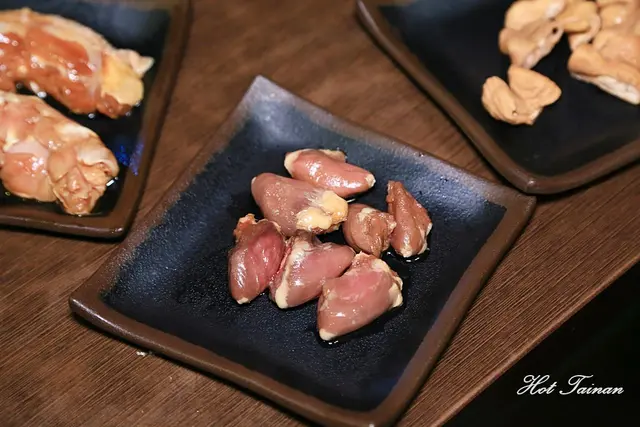 雞肉區塊分為薄片、厚片並以雞腿為主,經過店家調味後分別有九種雞腿肉喔!個人是滿喜歡雞腿肉的,不像雞肉片薄味道淡,相對雞腿肉更能烤出香氣,調味過的肉質,逼出肉汁,香氣足~不用沾醬就好吃喔!!