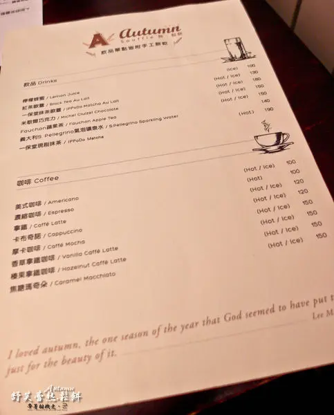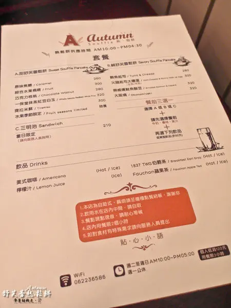 外帶菜單如下 (圖為Autumn舒芙蕾熱·鬆餅 粉絲團的)