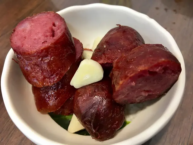 牛肉香腸還蠻特別的,第一次吃到,鹹甜鹹甜的口味是我很喜歡的,瘦肉的比例比較高,配點蒜頭好涮嘴!