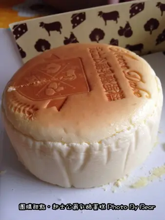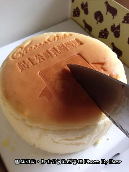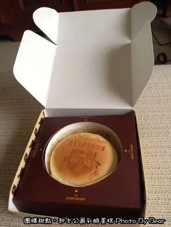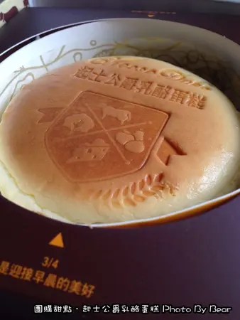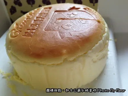 乳酪蛋糕的表層印有蛋糕的品名與店家LOGO的圖案與字樣