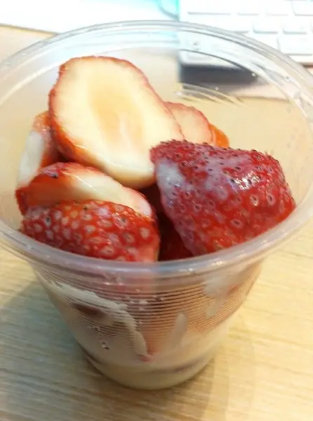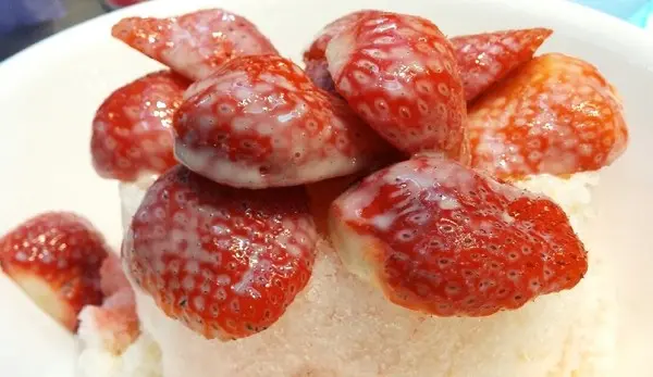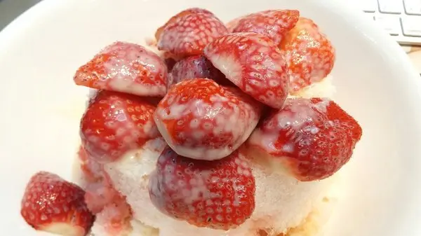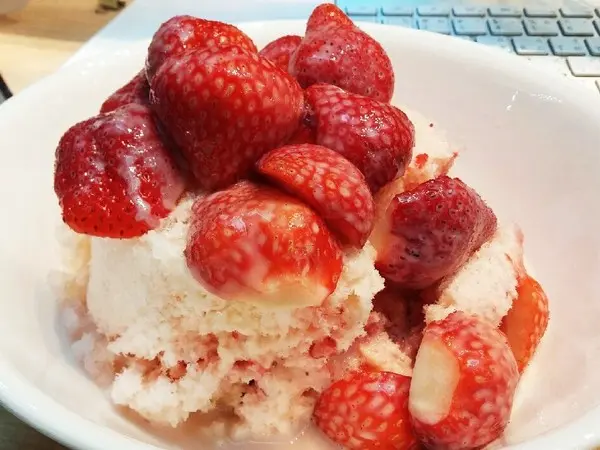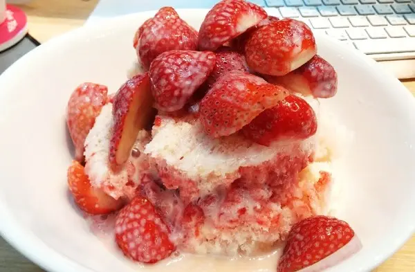 (草莓牛奶冰)的草莓都切半,並淋上煉乳!