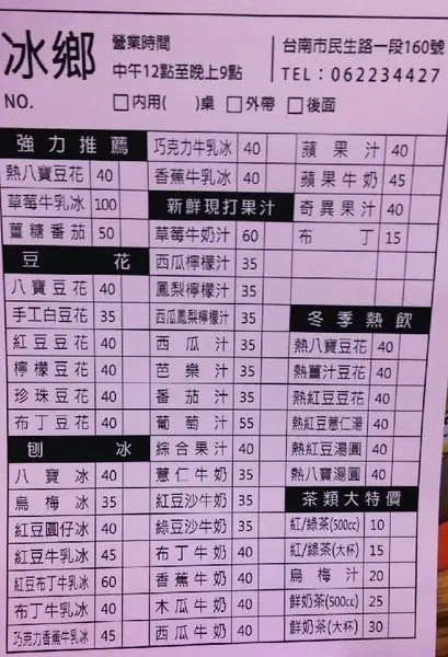 販售多種果汁,冰品,還有豆花.茶類.冬季熱飲類。