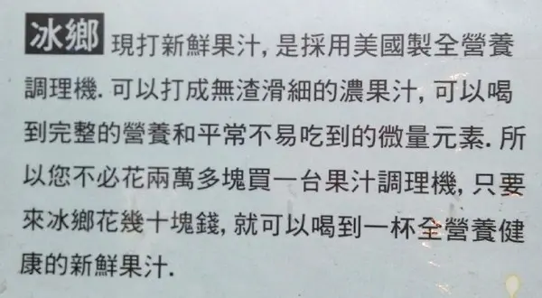 『冰鄉』看準此商機,也開始販售 季節水果冰,但是價位 卻只有 另一家的一半費用。