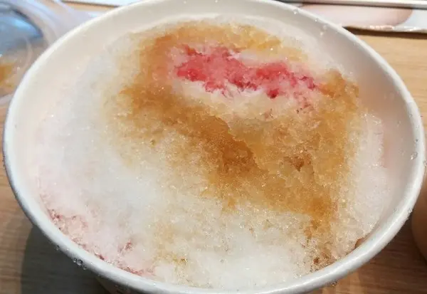 (草莓牛奶冰)的剉冰的部分,都已淋上 糖漿,煉乳,和新鮮草莓醬。