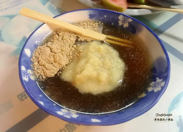 小碟子內盛裝的是獨門醬油、薑泥、甘草粉,看店家的報導上說還有放一點糖粉