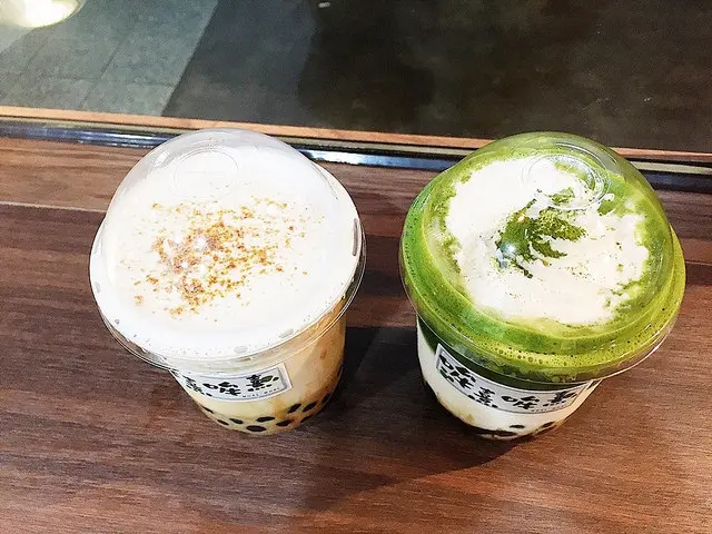 我跟姊姊點了一杯小山園抹茶拿鐵、台南關山黑糖拿鐵(飲料加珍珠不用錢)、