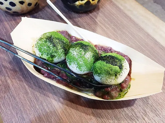 一口塞入,溫熱抹茶餡瞬間從嘴裡傾洩而出,糰子皮偏厚