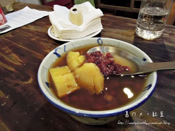 不一會兒紅豆湯上桌,上面還有地瓜,看到這飽滿的紅豆顆粒,不用想應該不錯吃XD
