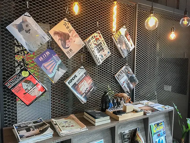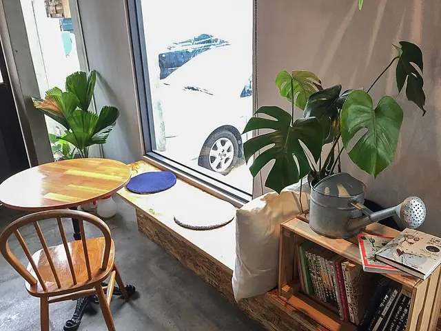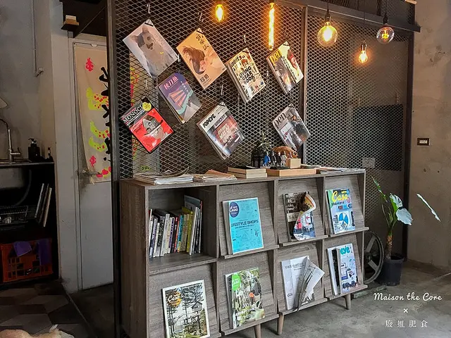 點綴著綠色植栽,多了清新感,一旁的書櫃裡還有提供書籍雜誌