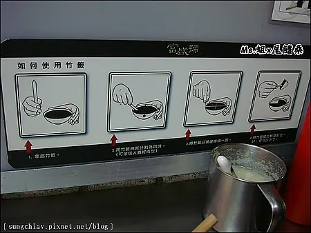 點好餐就找位置坐,四處都可以看到如何使用富盛號特殊竹籤餐具的使用說明步驟圖解。