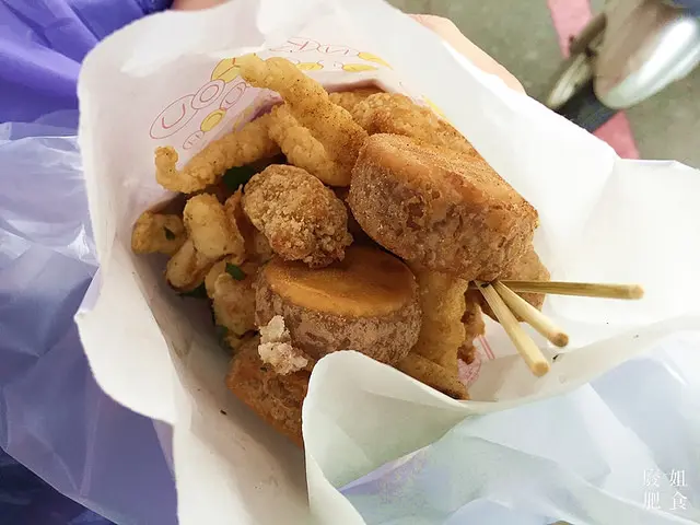 我們買了鹽酥雞、魷魚、番薯條、芋粿、三個芋餅,總共150元