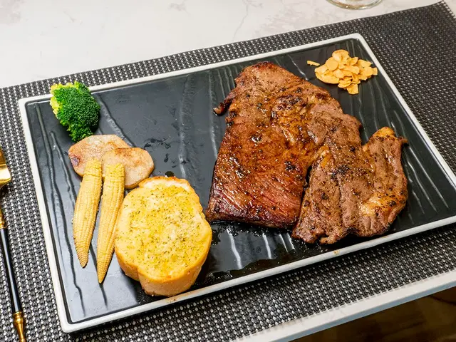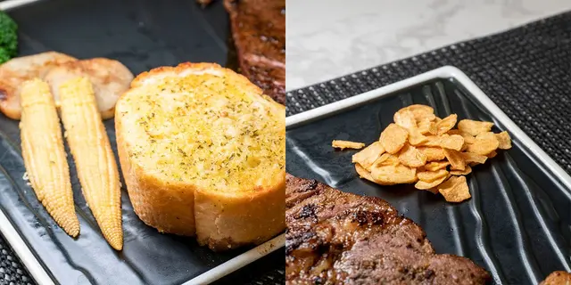 配菜的部分有我們很喜歡的蒜片,切塊的牛排放上一小片蒜片一起入口,光想到那香味就讓人口水直流啊~