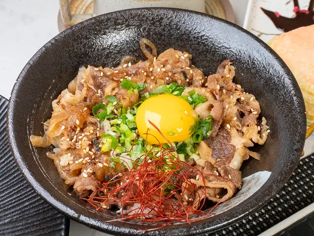 底層丼飯有淋上店家特調的壽喜醬汁,米飯入口濕潤濕潤的、鹹香好入口。搭配上層鋪得滿滿的軟嫩的牛五花肉,當然還有最重要的生蛋黃,攪拌均勻之後那好味道真的不容錯過❗️