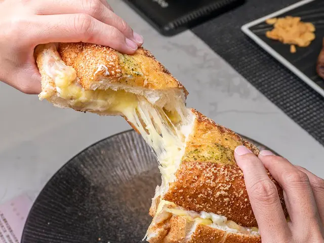 看我們拉拉拉拉,超級牽絲的,這也代表了店家放起司毫不手軟啊,起司控不要錯過的這道蒜香軟法佐乳酪燻雞👍