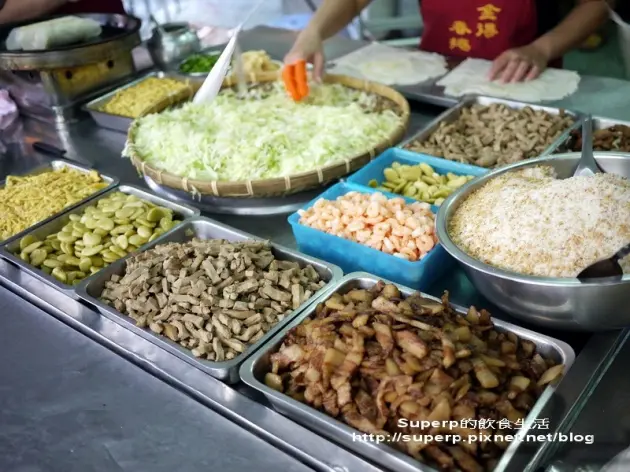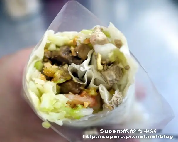 裡面的料相當的豐富,有高麗菜絲,肉絲,蝦仁,豆干,和花生粉…等等的食材。這春捲不會和一般吃到的那麼水,吃到最後餅皮都濕糊掉,這點我很喜歡。不過我覺得花生粉似乎對我來說有點過甜。