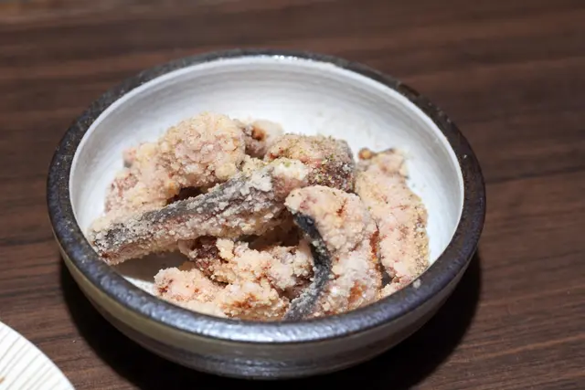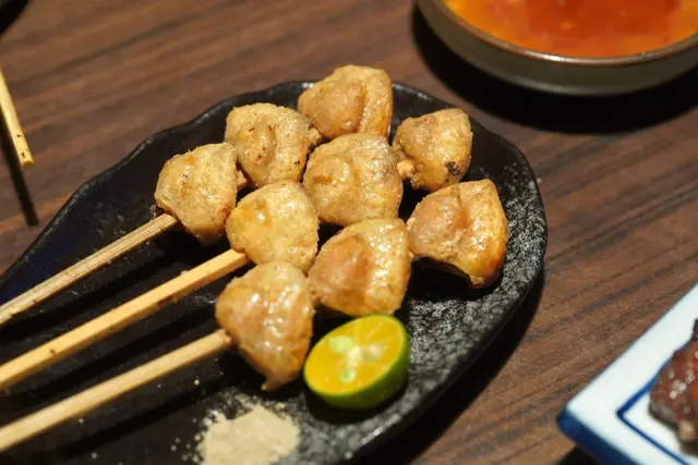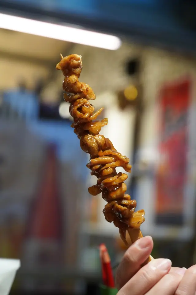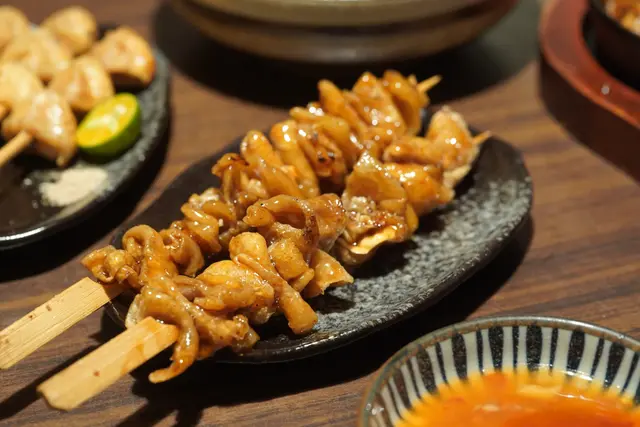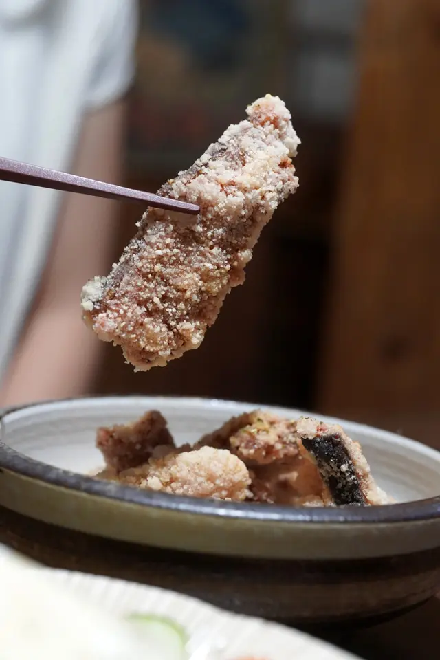 ▼烤雞皮:烤得酥脆焦香,油脂香氣十足但不會膩,醬汁鹹甜鹹甜唰嘴,很適合當下酒菜。