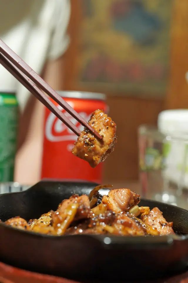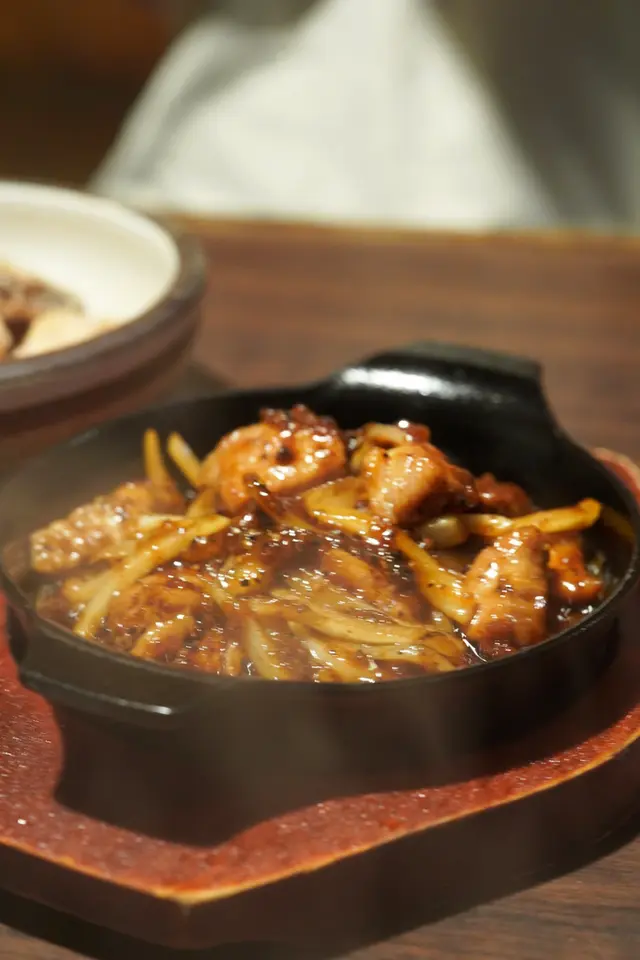 ▼鐵板骰子豬:鐵板吱吱作響,黑胡椒香氣隨風飄~骰子豬煎得恰到好處,肉質鮮嫩juicy,搭配洋蔥一起吃更美味!也更下酒!