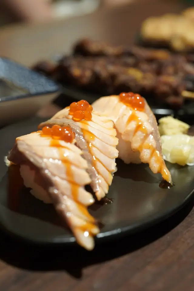▼炙燒鮭魚握壽司:鮭魚炙燒得恰到好處,油脂豐富,入口即化。