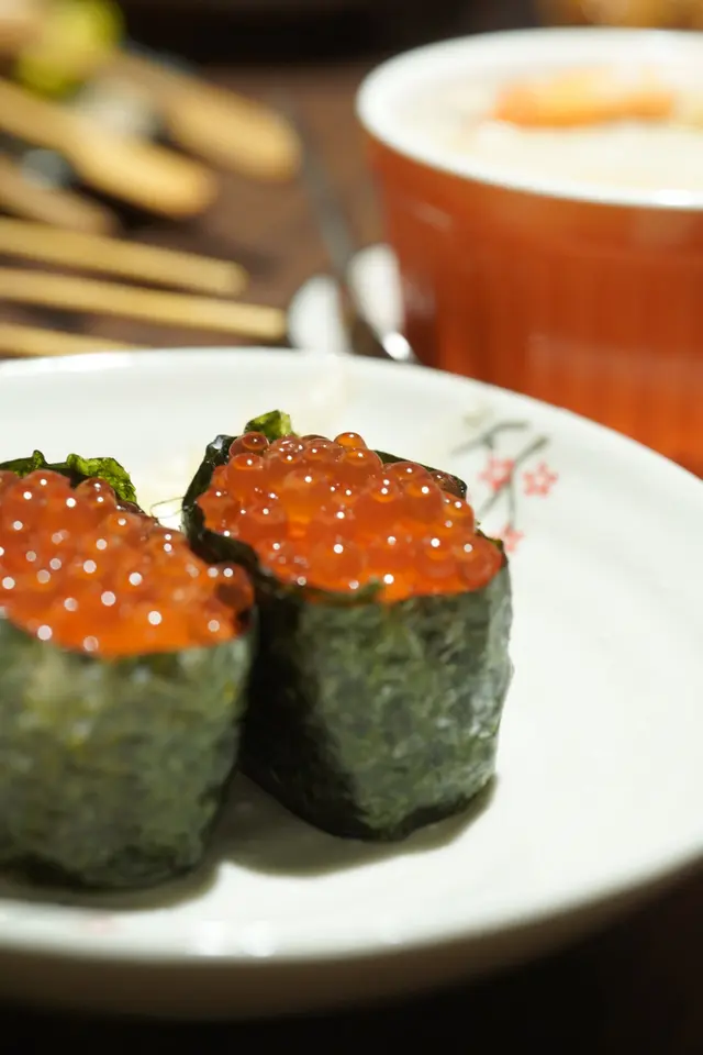 ▼鮭魚卵軍艦壽司:鮭魚卵顆顆飽滿,口感Q彈,搭配米飯非常合拍。