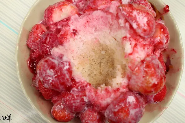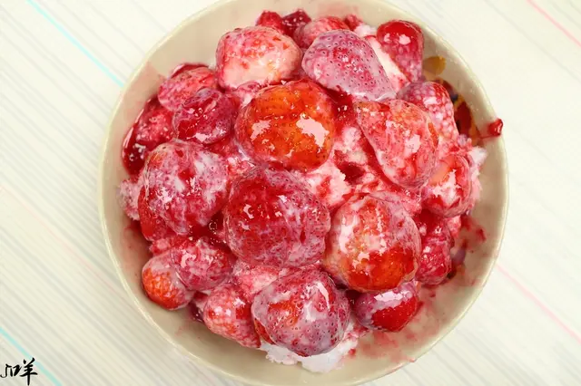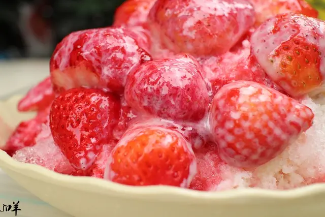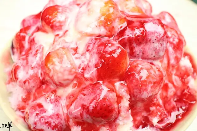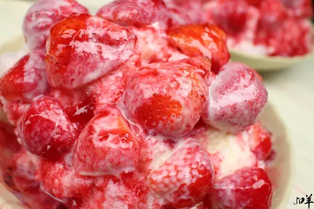 冰上擺滿切半的草莓,大顆小顆的都有,最表層有淋上草莓醬以及煉乳,剉冰之中還有加上店家熬煮的糖水在其中。