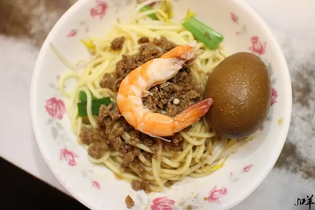 乾-擔仔麵,黃麵上面淋上肉燥和蝦仁搭配,還有放上一些豆芽菜,簡單的搭配。