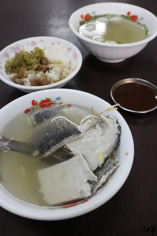魚皮湯,一上桌就發覺阿德的魚皮湯似乎有些不一樣,一開始點餐時,老闆會問客人要生皮還是裹漿的,生皮就是去鱗後,魚皮部分切成長條片狀沒有再做其他處理,而裹漿的則是在魚皮裁切成塊狀後,在一側裹上一層魚漿,而這邊裹上的魚漿就跟做魚丸的魚漿是一樣的,兩種主要就是在魚肉多寡以及口感上的差異。