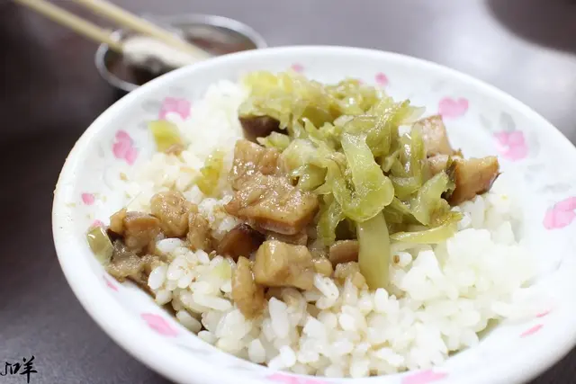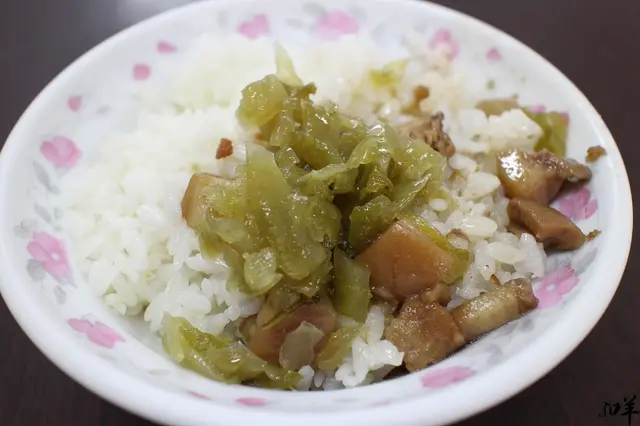 肉燥飯看起來一整個平凡無奇,單純一碗飯上面放上酸菜以及少少的肉燥。